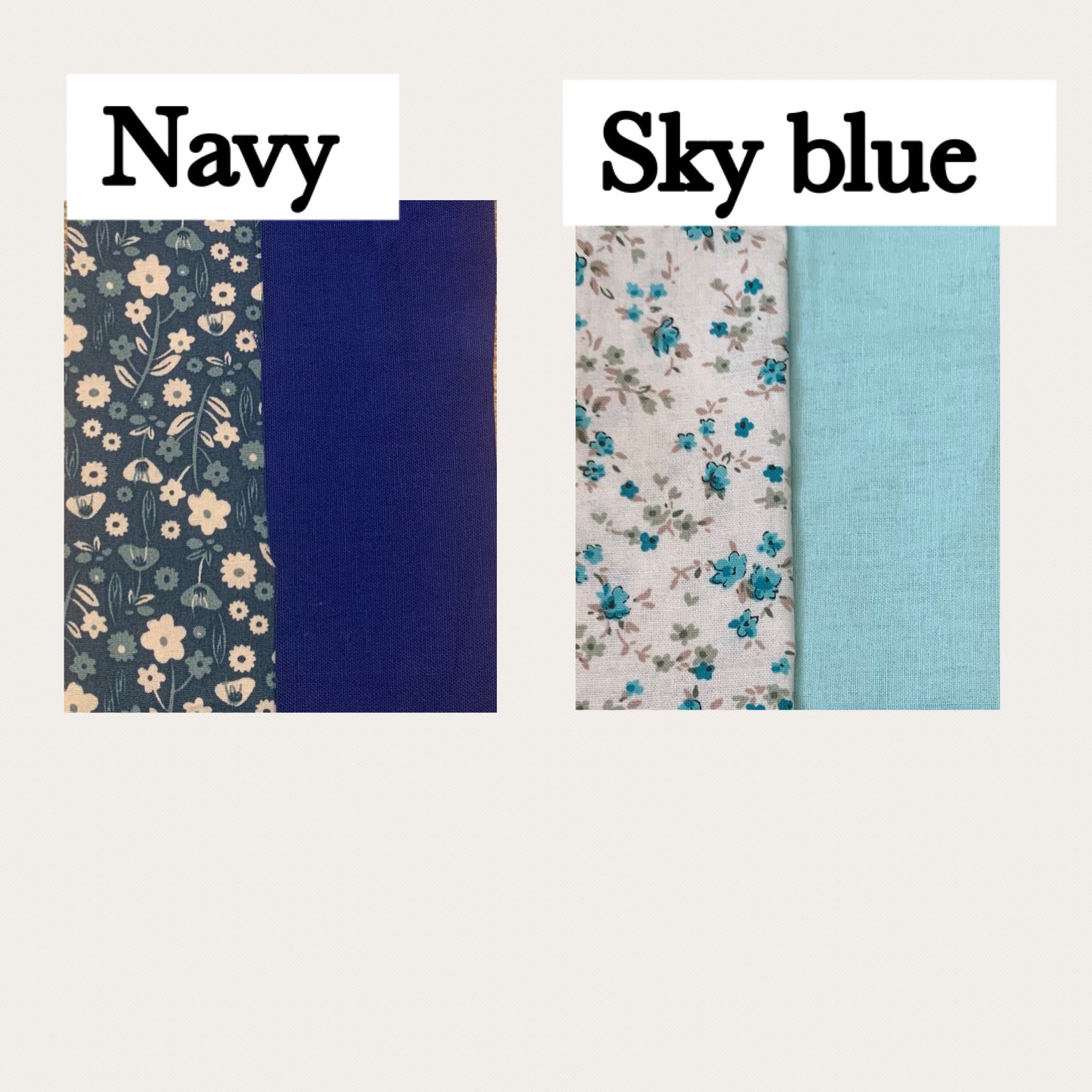 3 different sets to pick from: yellow floral, navy and sky blue.